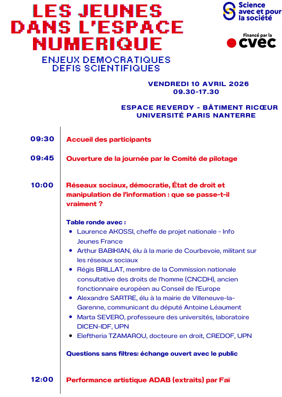 La montée en puissance des plateformes numériques transforme profondément les conditions de production, de circulation et de légitimation des savoirs, tout en redéfinissant les modalités d’exercice de la citoyenneté démocratique. Le Comité de pilotage du « Jeunes HUB », dispositif participatif de l’Université Paris Nanterre, développé dans le cadre des actions « Science avec et pour la société », organise sa journée autour du thème : « Les jeunes dans l’espace numérique : enjeux démocratiques et défis scientifiques ».