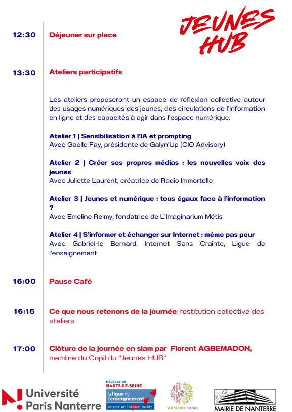 Les personnes intéressées peuvent également découvrir les éditions précédentes du Jeunes HUB sur la chaîne YouTube de l’Université Paris Nanterre, qui présente les échanges et les initiatives portées par ce dispositif participatif.