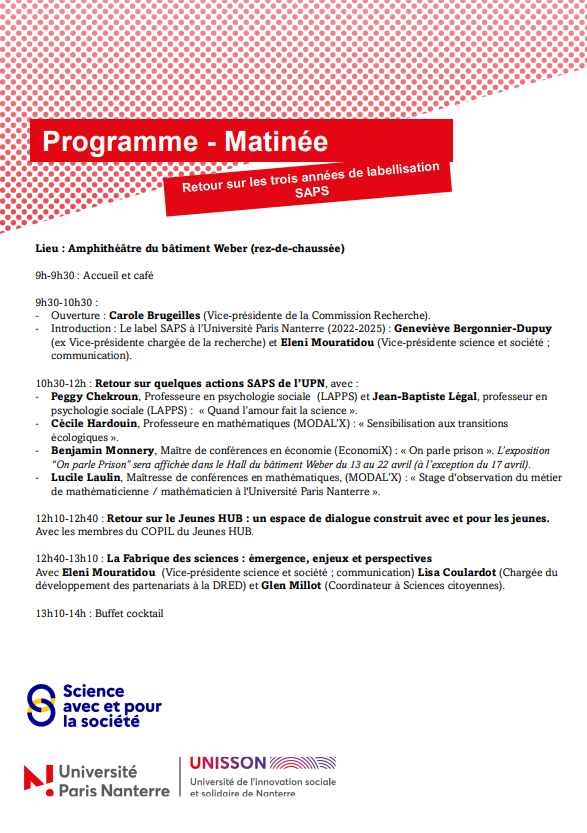 Evénement SAPS - Retour sur les trois années de labellisation et lancement de la Fabrique des sciences - 22 avril - Campus de Nanterre