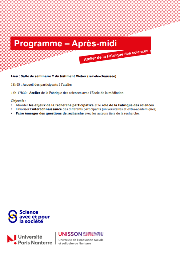 Afin de faire un retour sur certaines actions SAPS déployées tout au long du projet Sciences in cité et de lancer officiellement le mise en place de la Fabrique des sciences, nous organisons le mercredi 22 avril une journée qui réunira des acteurs académiques et non académiques.