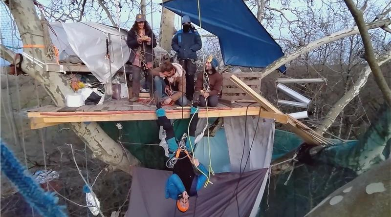 « Alliances terrestres » témoigne de la détermination des contestataires qui imposent leurs corps face aux engins de chantier. Ils et elles grimpent dessus, s’y enchaînent, montent aux arbres et s’y installent pour empêcher leur abattage, allant jusqu’à une occupation de 45 jours en hiver.