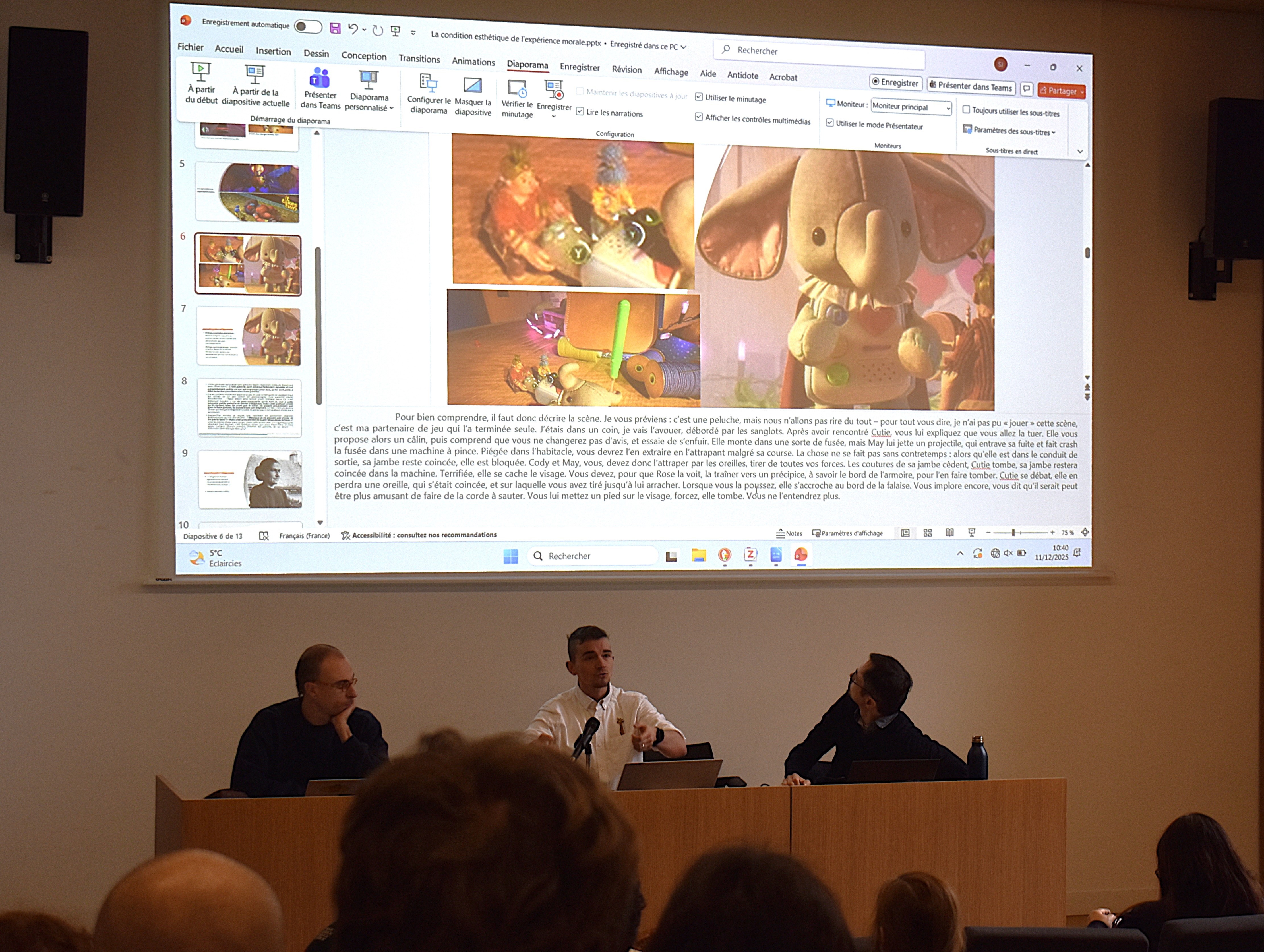 Jim Schrub nous a présenté It takes two, en particulier une scène bien connue du jeu : la mort de la peluche éléphante Cutie. Cette partie de l'aventure illustre en quoi la condition esthétique d’un jeu joue sur l’expérience morale du joueur ou de la joueuse. En effet, si l’on compare Grand Theft Auto (GTA) et It takes two, on remarque que le caractère moral d’une expérience vidéoludique, en raison de son design, appelle à une certaine sensibilité (les joueurs et joueuses n'ont aucun problème à écraser des piétons dans GTA, mais il leur est impossible de démembrer la poupée Cutie dans It takes two).