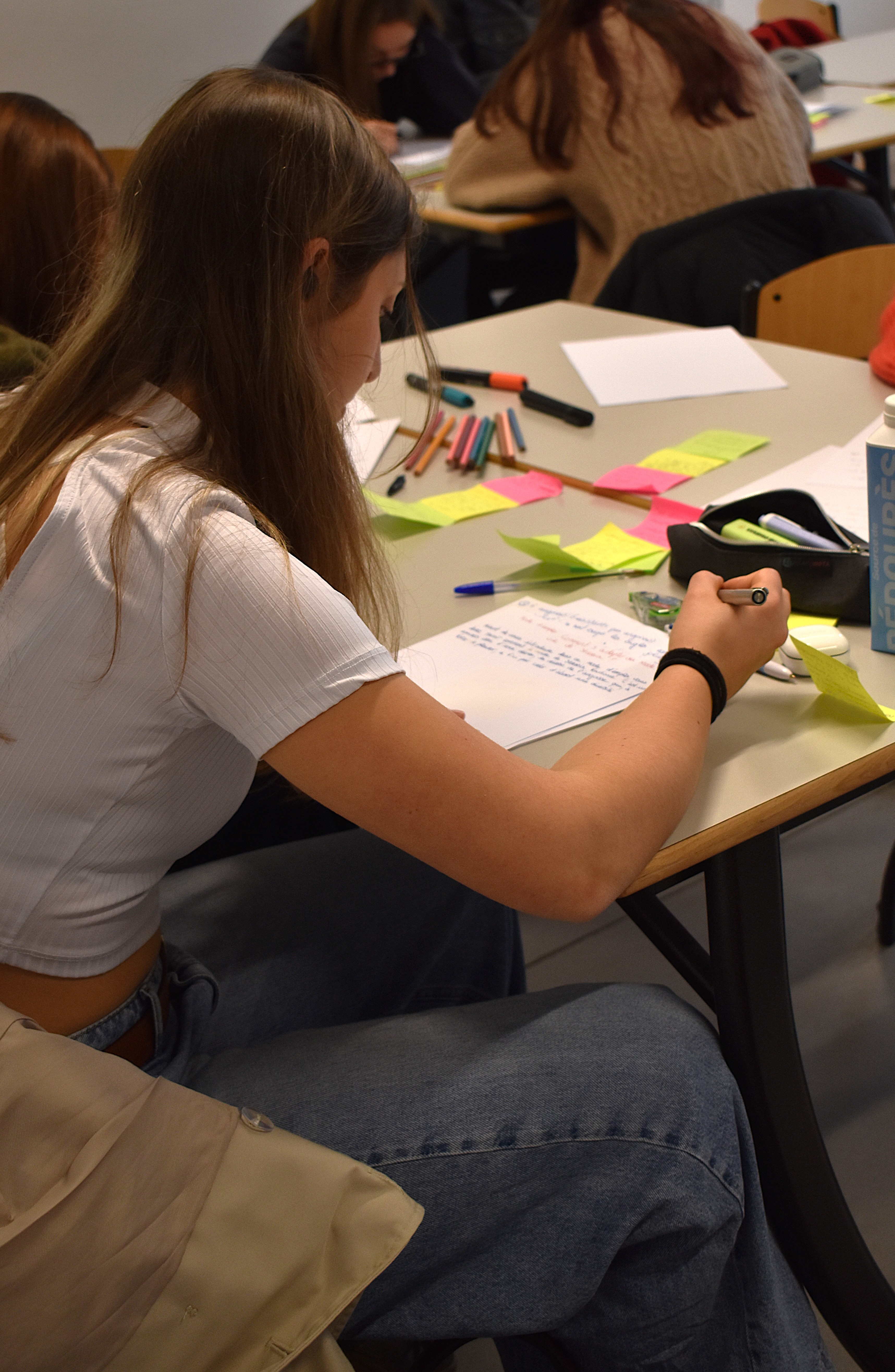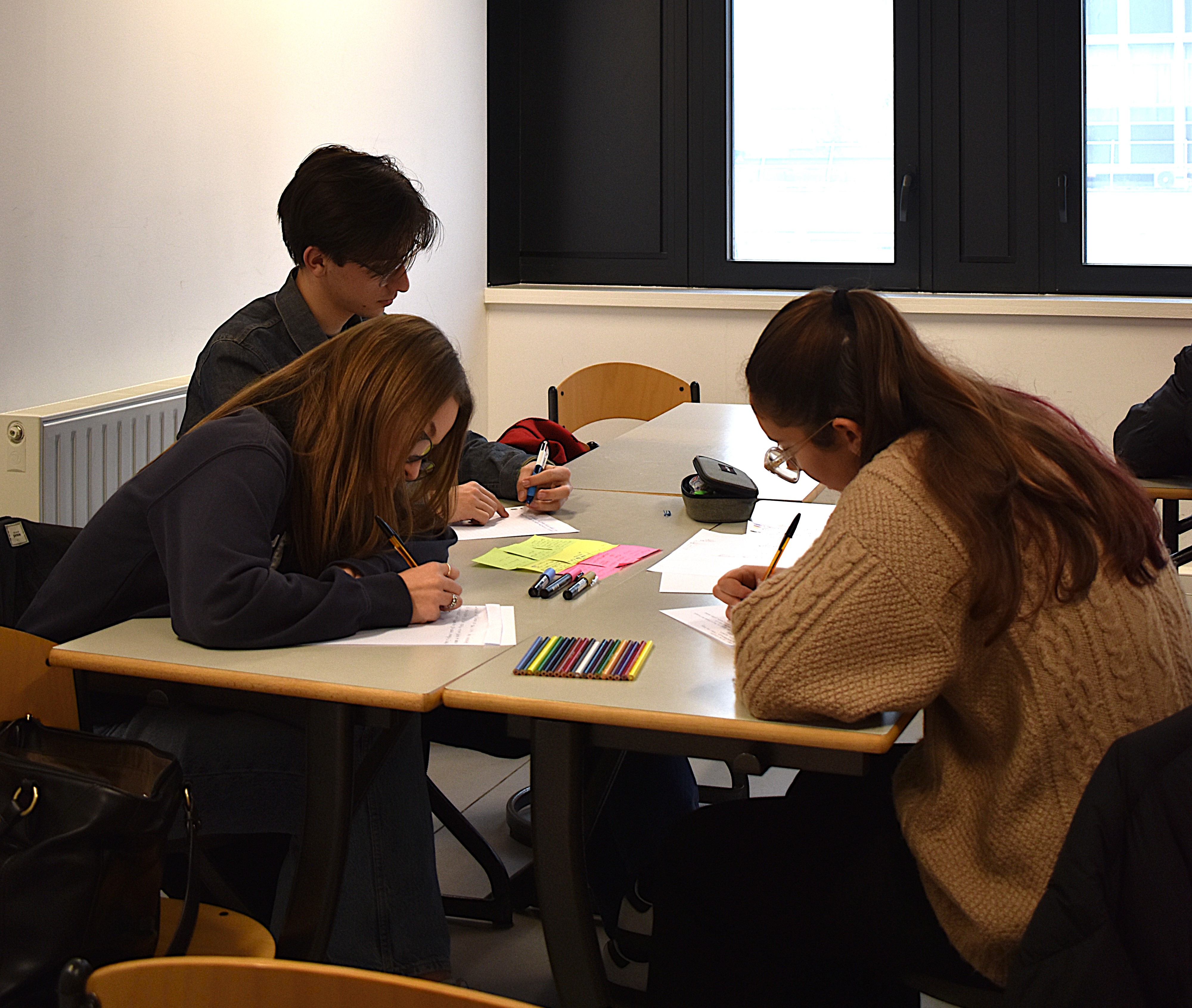 Crystal Aslanian (artiste sonore) et Héloïse Brézillon (poète et romancière), toutes deux docteures en Recherche-création (recherches appliquées à l’art), ont pu accueillir une dizaine de lycéens et lycéennes dans leur atelier de spéculation et d’écriture. L’enjeu de cette pratique artistique est d’aménager un espace de création collective, où tout le monde échange et participe à la construction d'un récit à la forme hybride entre savoir et art.