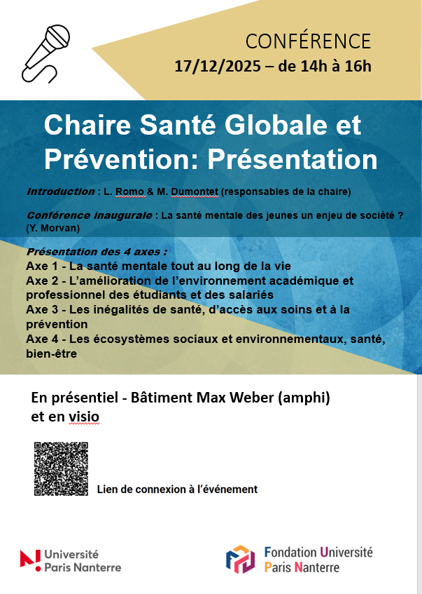 Projet labelisé SAPS - Filles et maths : une équation lumineuse - 16 décembre 202516 décembre 2025Le projet « Filles et maths: une équation lumineuse », porté par Philippe Soulier, professeur de mathématiques à l'UFR SEGMI et membre de l' équipe MODAL’X, a obtenu le label SAPS en 2025. Une journée d’activités se tiendra le 16 décembre 2025 à l’Université Paris Nanterre, en partenariat avec Femmes & mathématiques, Animath et la Fondation Blaise Pascal. Lire la suite - Chaire Santé Globale et Intervention - Conférence de présentation17 décembre 2025