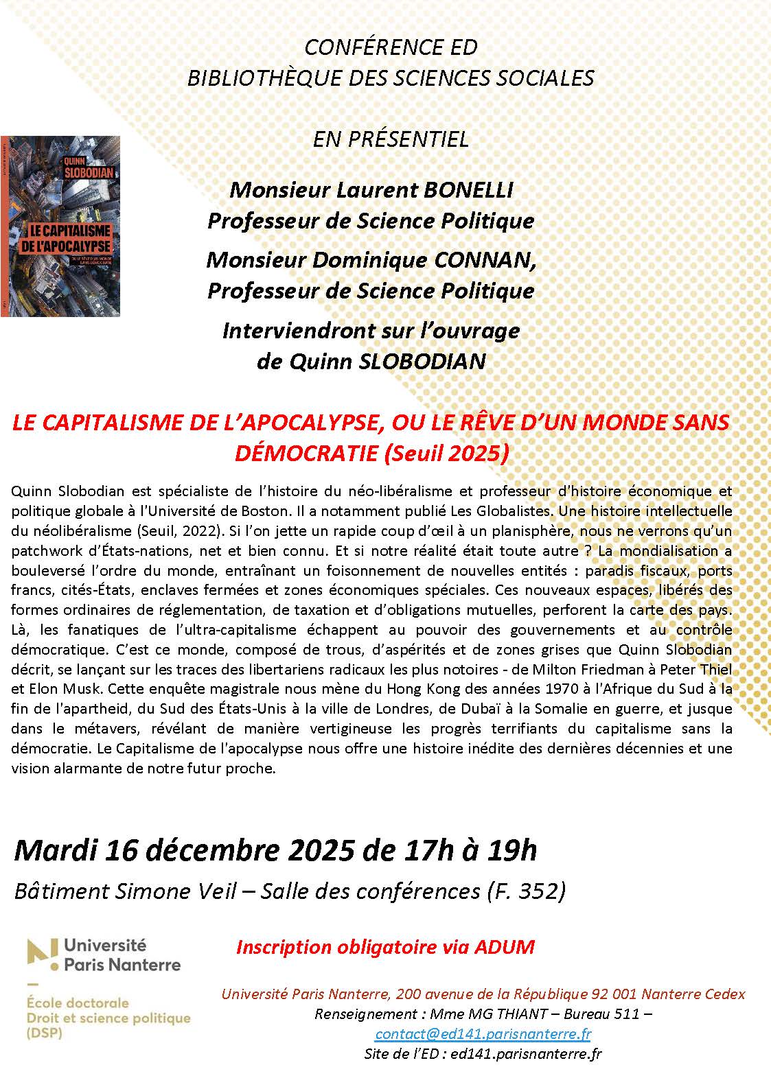 Scientific tools for co-constructive research in the field social welfare15 décembre 2025 - 19 décembre 2025 - Cycle Bibliothèque des sciences sociales16 décembre 2025Le cycle « Bibliothèque des sciences sociales » est un nouveau séminaire de recherche au sein de l’école doctorale. Il propose aux doctorant.es un programme de lecture, de discussion et de commentaire d’ouvrages ou d’articles généraux de sciences sociales sans lien nécessaire avec leur thèse. Cet exercice permet la constitution d’une culture générale scientifique qui contribue tant à leur professionnalisation qu’à nourrir leur réflexion spécifique en la replaçant dans les grands débats théoriques du moment. Il leur permet également de se tenir au courant de l’actualité scientifique dans la discipline et des controverses qui la structurent. A partir de ces lectures et de ces débats, le séminaire constituera également un moment privilégié pour partager des questionnements ou des savoir-faire en matière d’écriture, d’administration de la preuve ou d’usage du matériau d’enquête plus directement en lien avec les thèses. Lire la suite