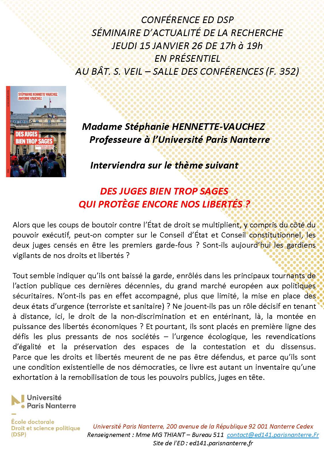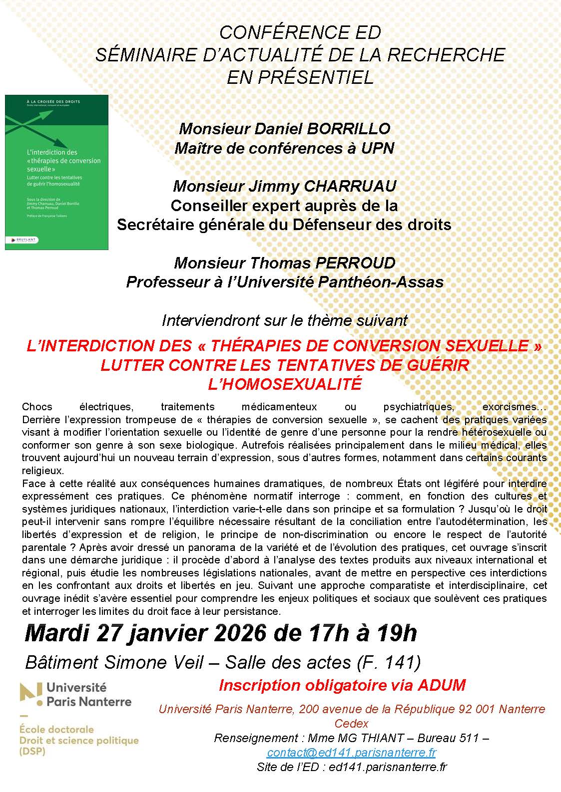 Intégrité scientifique et déontologique : principes fondamentaux et considérations réglementaires encadrant le travail de recherche (TD)14 novembre 2025 - 11 décembre 2025 - Colloque"L'ÉGALE DIGNITÉ Chemins croisés d'une pensée partagée Mireille Delmas-Marty et Paul Bouchet"26 novembre 2025HommagePaul Bouchet et Mireille Delmas-Marty étaient animés par la même passion du droit. Un droit vivant et non un droit fossilisé, un droit inspiré par la « dignité et la valeur de la personne humaine », un droit mobilisateur de forces collectives et porteur de solidarité. Lire la suite