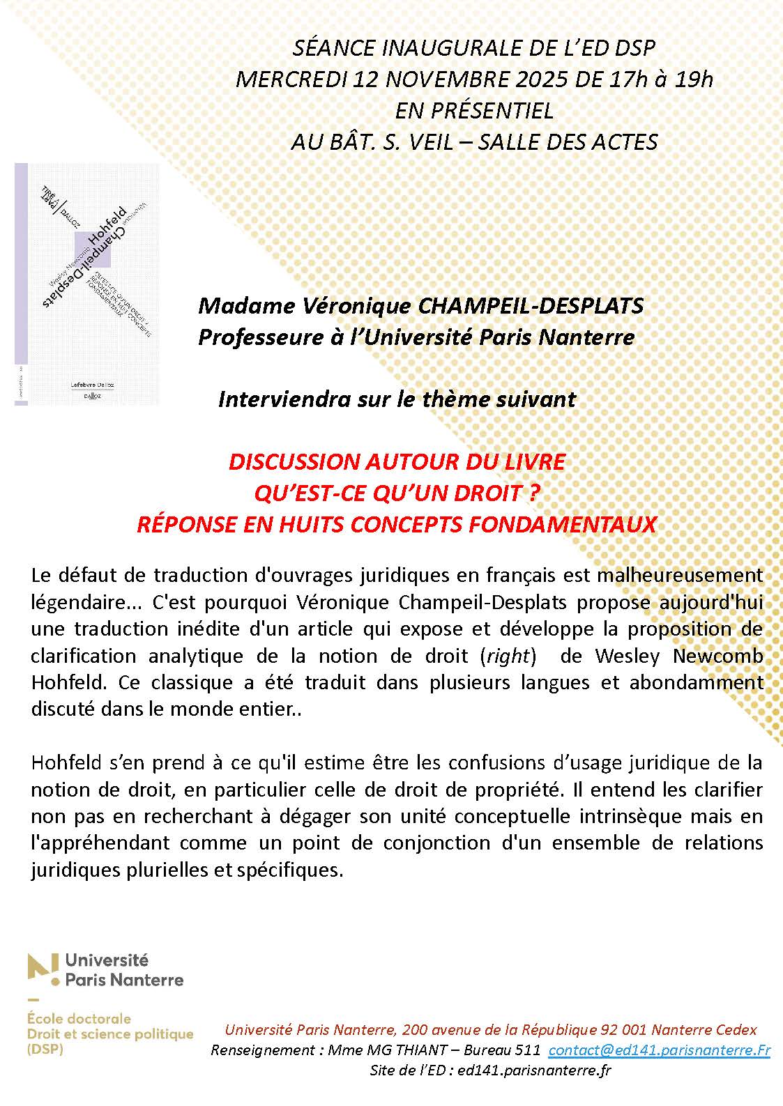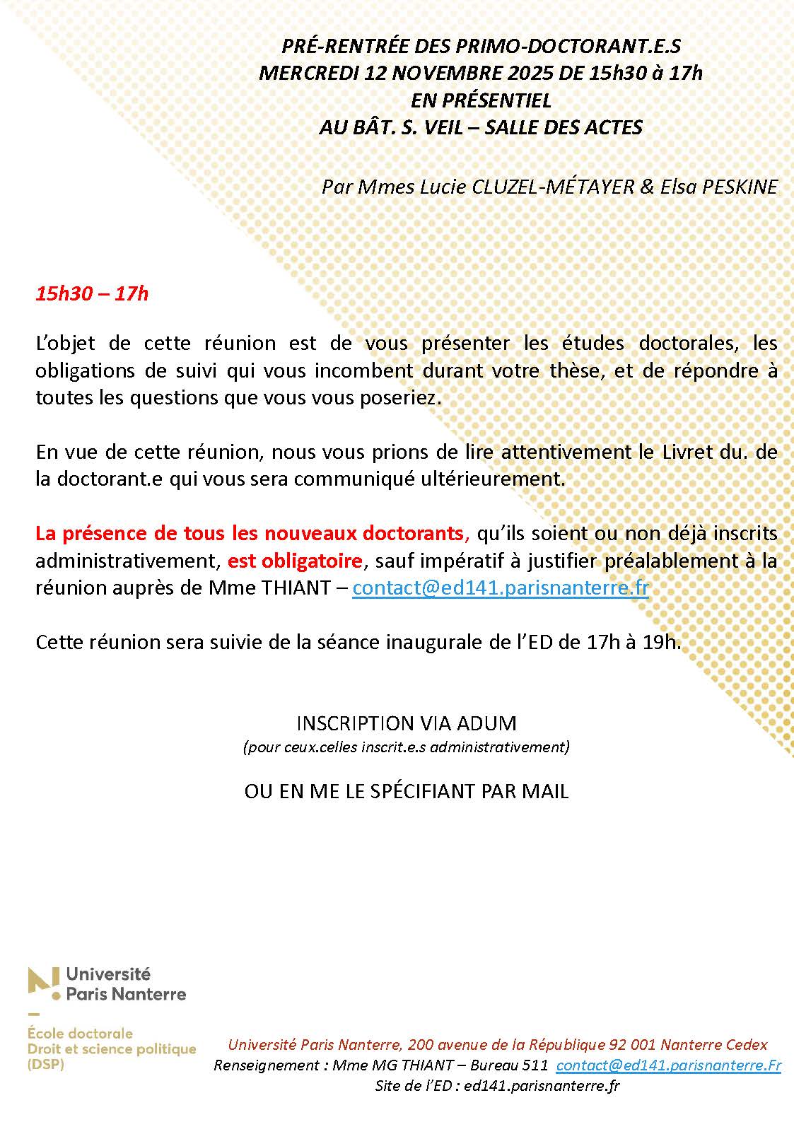 - Programme 2025/2026 : Les Midines du CEDIN7 novembre 2025 - 9 avril 2026Les Midines (les midis du CEDIN) : qu’est-ce que c’est ?C’est une pause méridienne que l’on partage collectivement en partant à la découverte d’un.e auteur.e et de son oeuvre.C’est un séminaire général interdisciplinaire au cours duquel un.e chercheur.euse présente un de ses ouvrages récents en droit international public ou privé, en relations internationales ou en études européennes et l’ouvre à la discussion.C’est un jeudi ou un vendredi par mois à l’Université Paris Nanterre à l’UFR DSP (Bâtiment Veil) de 12h30 à 14h.C’est un espace de découverte académique convivial, où chacun.e vient avec sa disponibilité intellectuelle et son déjeuner.C’est une direction scientifique assurée par Sophie Grosbon et Lilian Larribère, et un programme, qui nous l’espérons, vous attirera nombreuses et nombreux. Lire la suite