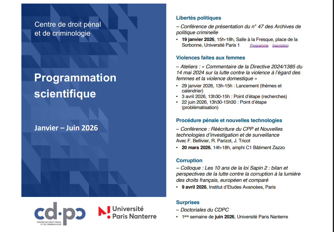 Parcours de formation « Qualité des données de recherche » (Quador)7 novembre 2025 - 20 janvier 2026 - Programme 2025/2026 : Les Midines du CEDIN7 novembre 2025 - 9 avril 2026Les Midines (les midis du CEDIN) : qu’est-ce que c’est ?C’est une pause méridienne que l’on partage collectivement en partant à la découverte d’un.e auteur.e et de son oeuvre.C’est un séminaire général interdisciplinaire au cours duquel un.e chercheur.euse présente un de ses ouvrages récents en droit international public ou privé, en relations internationales ou en études européennes et l’ouvre à la discussion.C’est un jeudi ou un vendredi par mois à l’Université Paris Nanterre à l’UFR DSP (Bâtiment Veil) de 12h30 à 14h.C’est un espace de découverte académique convivial, où chacun.e vient avec sa disponibilité intellectuelle et son déjeuner.C’est une direction scientifique assurée par Sophie Grosbon et Lilian Larribère, et un programme, qui nous l’espérons, vous attirera nombreuses et nombreux. Lire la suite