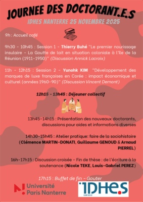 - Journée des doctorant·es25 novembre 2025Journée d'études organisées par les doctorantes et doctorants de l'IDHE.S Lire la suite