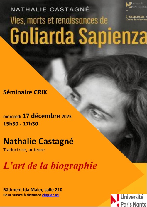 Projet labelisé SAPS - Filles et maths : une équation lumineuse - 16 décembre 202516 décembre 2025Le projet « Filles et maths: une équation lumineuse », porté par Philippe Soulier, professeur de mathématiques à l'UFR SEGMI et membre de l' équipe MODAL’X, a obtenu le label SAPS en 2025. Une journée d’activités se tiendra le 16 décembre 2025 à l’Université Paris Nanterre, en partenariat avec Femmes & mathématiques, Animath et la Fondation Blaise Pascal. Lire la suite - L'art de la biographie17 décembre 2025Nathalie Castagné, traductrice de l’œuvre complète de Goliarda Sapienza et auteure de «Vies, morts et renaissances de Goliarda Sapienza» (Seuil) est l'invitée de ce séminaire sur l'art de la biographie. Lire la suite