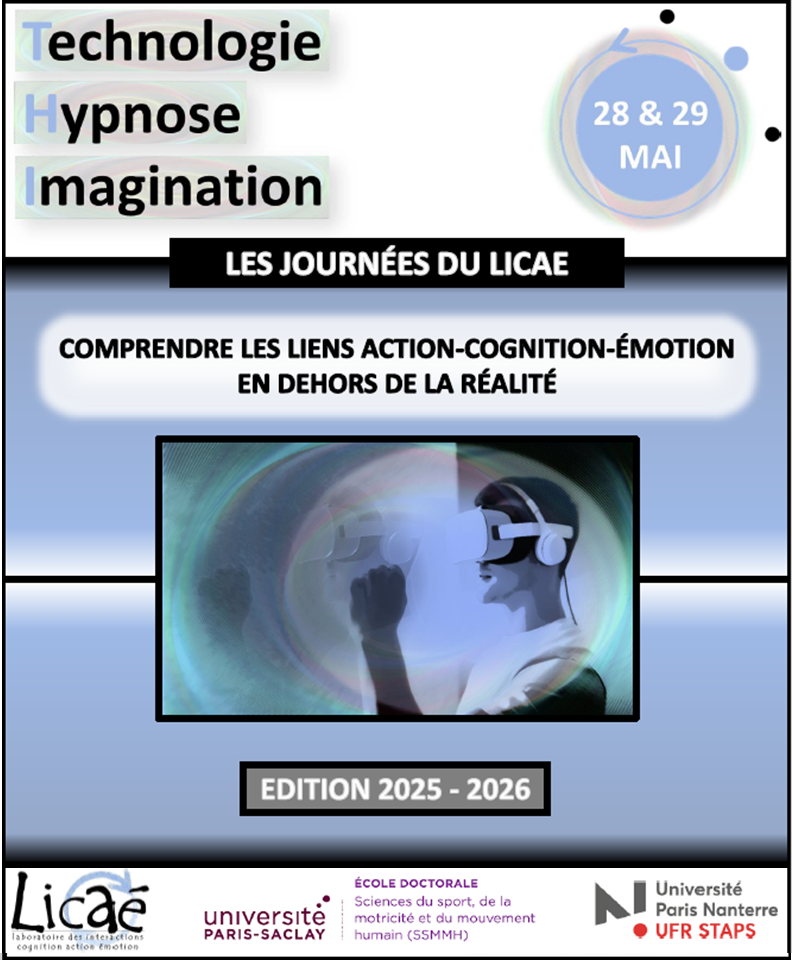 - LICAÉ journées d'étude 202628 mai 2026 - 29 mai 2026Les journées d’étude « Technologie, Imagination, Hypnose : comprendre les liens action–cognition–émotion en dehors de la réalité » ont pour ambition de réunir des chercheurs confirmés et jeunes scientifiques, afin d’examiner les processus cognitifs, perceptivo-moteurs et sociaux mobilisés lorsque l’être humain agit, perçoit et ressent dans des contextes qui s’éloignent de la réalité immédiate : états hypnotiques, environnements immersifs, interactions simulées avec des avatars numériques. Lire la suite